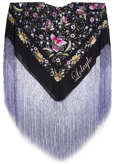 Nº 43.  MANTÓN DE MANILA EN SEDA NATURAL COLOR NEGRO  BORDADO CON          FLORES MULTICOLOR  485€.   MEDIDAS  1.30 x 1.30 cm. MAS 60cm. DE FLECADURA Y ENREJADO SEDA TONO LILA/MALVA.