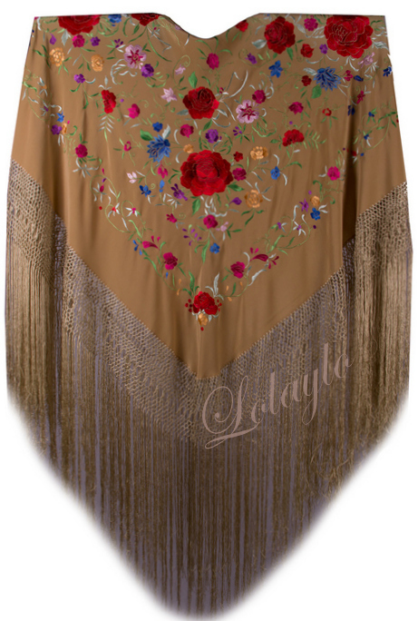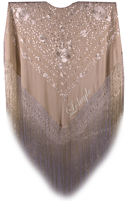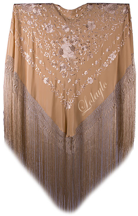 Nº 4.2  MANTÓN DE MANILA EN  SEDA NATURAL  EN COLOR BEIGE BORDADO   CON HILO DE SEDA EN BEIGE. MEDIDAS 130×130 cm. MAS 60 cm. FLECADURA Y ENREJADO SEDA 230€. Disponible en gran variedad de colores.