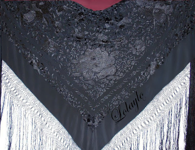 MANTÓN NEGRO-PLATA      Nº 2.   MANTÓN DE MANILA EN SEDA NEGRA CON BORDADOS EN HILO  DE SEDA COLOR PLATEADO. MEDIDAS 1.30 x 1.30 cm. MÁS 60 cm. DE FLECADURA Y ENREJADO  SEDA 230€.  TAMBIÉN  DISPONIBLE CON BORDADOS BEIGE Y MARFIL.