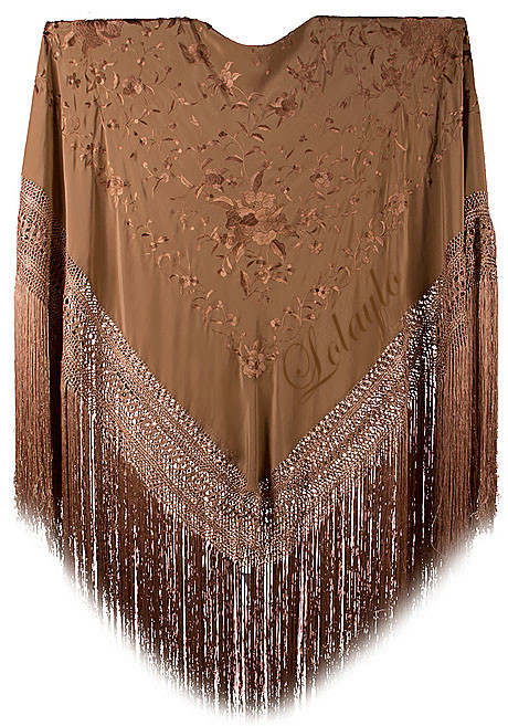 Nº 34.  MANTÓN DE MANILA EN SEDA NATURAL COLOR TOSTADO  CON MOTIVOS      FLORALES  275€.  MEDIDAS 1.30 x 1.30 cm.  MAS 60 cm. DE FLECADURA Y ENREJADO.