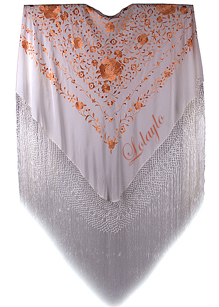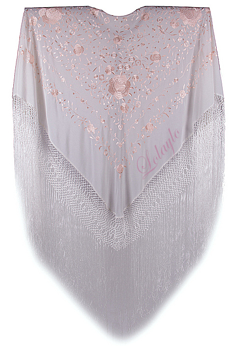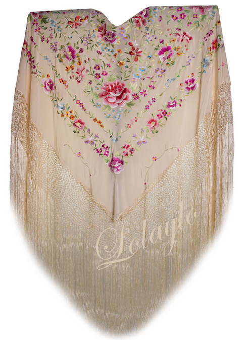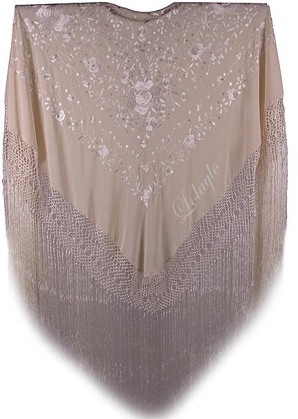 Nº 4.1   MANTÓN DE MANILA EN SEDA NATURAL EN COLOR BEIGE CLARO BORDADO EN EL MISMO TONO. MEDIDAS 130×130 cm. MAS 60cm. DE FLECADURA Y ENREJADO  230€.  Disponible en diferentes colores.