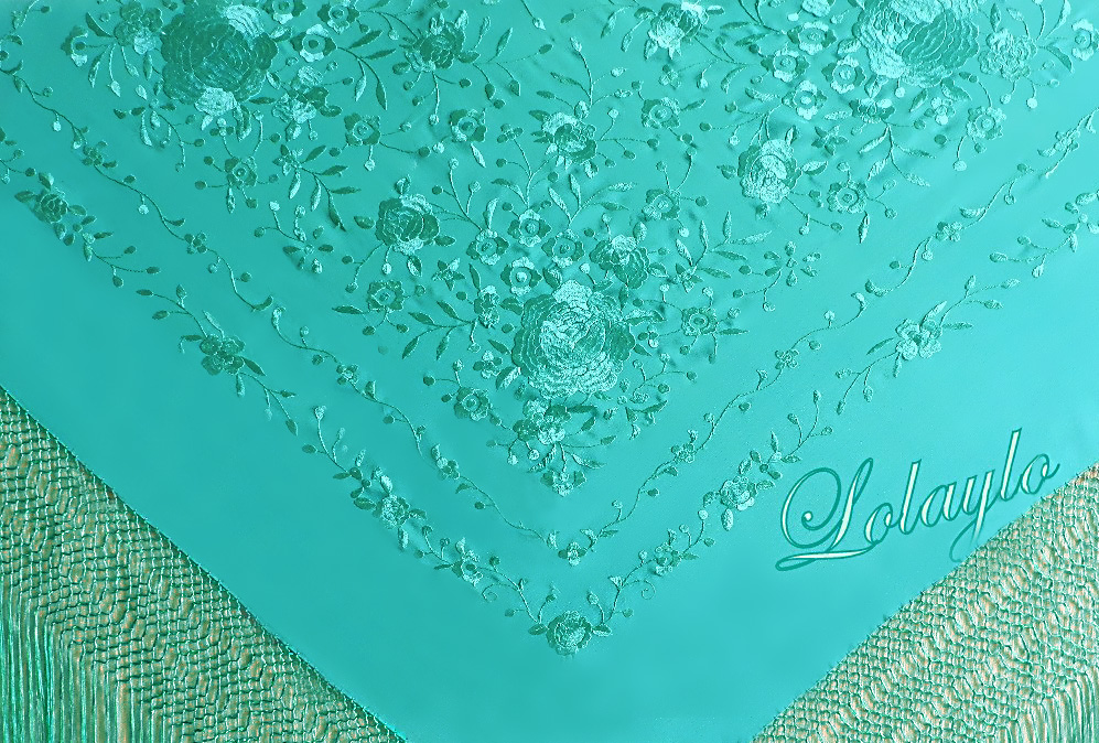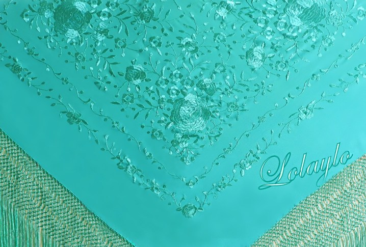 Nº 9.  MANTÓN DE MANILA EN SEDA NATURAL  COLOR VERDE AGUA CON    BORDADOS DE HILO DE SEDA EN EL MISMO TONO  230€.  MEDIDAS 130x130cm.   MAS 60 cm. DE FLECADURA Y ENREJADO SEDA.