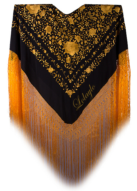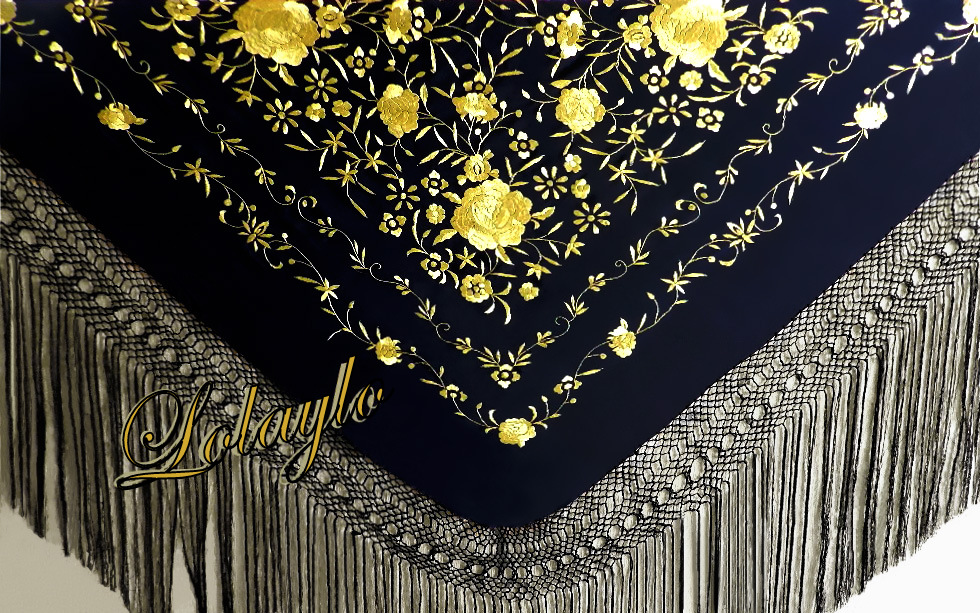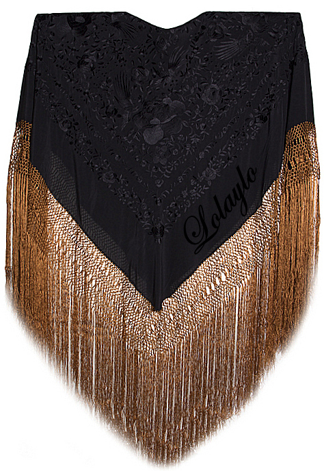 LKV - copiaNº1.   MANTÓN DE MANILA EN SEDA NEGRA CON PRECIOSOS BORDADOS EN HILO  DE SEDA COLOR ORO. 230€. MEDIDAS 1.30 x 1.30 cm. MÁS 60 cm. DE FLECADURA Y  ENREJADO SEDA.