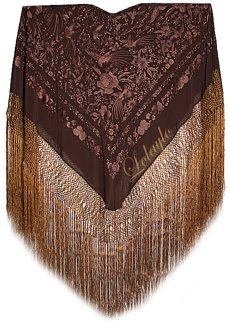 Nº  55.  MANTÓN DE MANILA EN SEDA COLOR MARRÓN  Y BORDADOS CON        MOTIVOS  FLORALES Y PÁJAROS.  485€. MEDIDAS  130 x 130 cm. MAS 60cm. DE FLECADURA Y ENREJADO SEDA COLOR ORO VIEJO.
