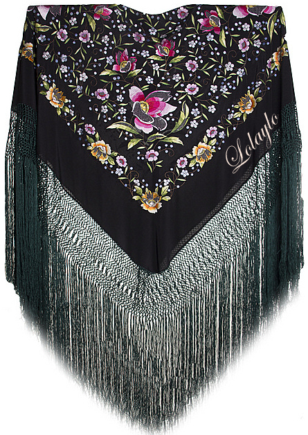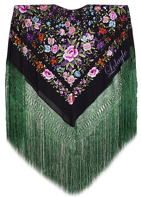 Nº 47.  MANTÓN DE MANILA EN SEDA NATURAL COLOR NEGRO  BORDADA CON                  FLORES Y MULTICOLOR  Y  LARGA FLECADURA EN SEDA TONO VERDE.                MEDIDAS 1.30 x 1.30 cm.  520€.  Agotado por el momento con flecadura verde.     DISPONIBLE CON FLECADURA EN NEGRO y COLOR COBRE.