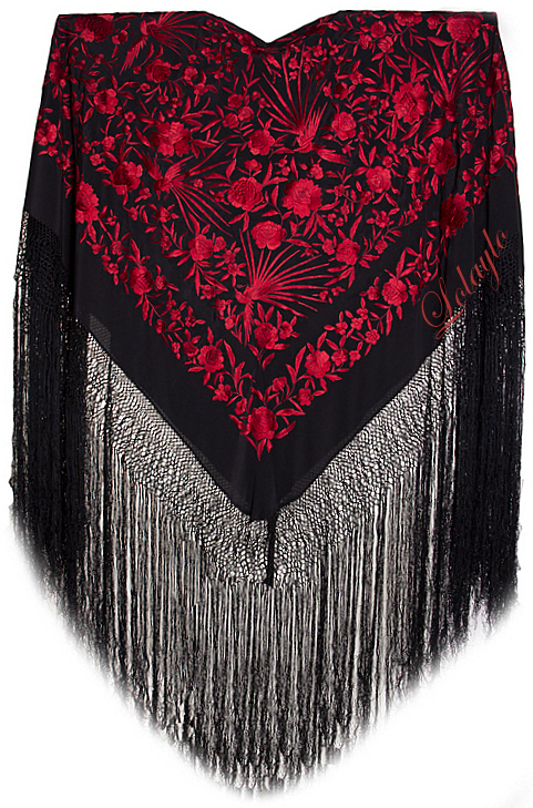 Nº 50.  MANTÓN DE MANILA EN SEDA NATURAL COLOR NEGRO  BORDADA CON          FLORES Y PÁJAROS EN ROJO  399€.   MEDIDAS  MEDIDAS 1.30 x 130 cm. MAS 60cm. DE FLECADURA Y ENREJADO SEDA.  (AGOTADO POR EL MOMENTO)