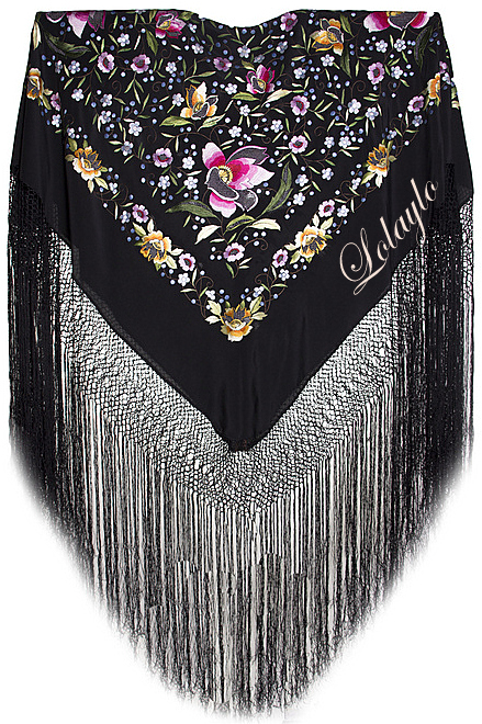 Nº 44.  MANTÓN DE MANILA EN SEDA NATURAL COLOR NEGRO  BORDADO CON        FLORES MULTICOLOR  485€. MEDIDAS 1.30 x 1.30 cm. MAS 60cm. DE FLECADURA                                                ENREJADO  SEDA.