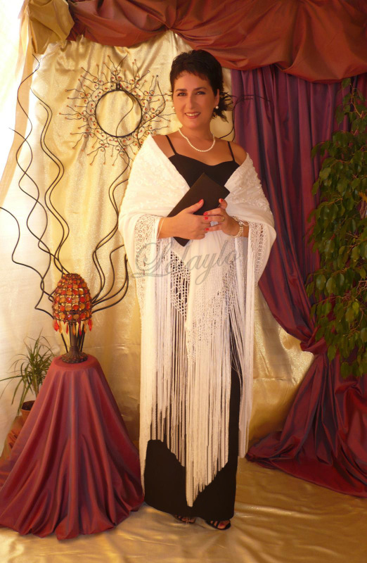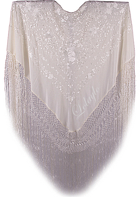 Nº 3.2   DETALLE DEL MANTÓN ANTERIOR EN SEDA MARFIL BORDADO CON HILO    DE  SEDA MARFIL.  TAMAÑO 130×130 cm.  MAS 60 cm. DE FLECADURA Y              ENREJADO SEDA 230€.  Disponible en diferentes colores.