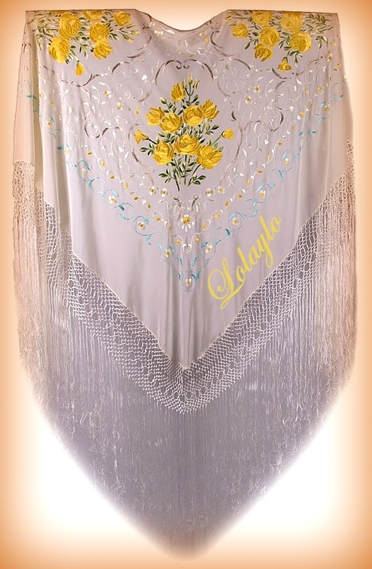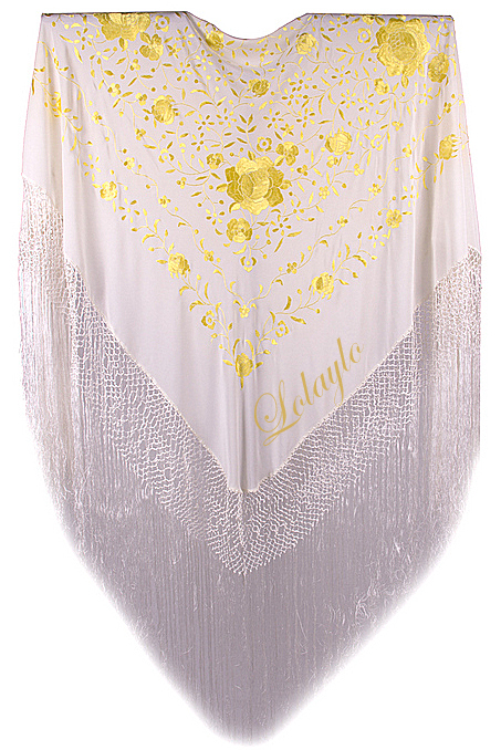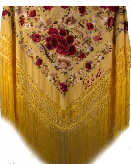 Nº  26.  MANTÓN DE MANILA EN SEDA NATURAL   COLOR MARFIL CON                BORDADOS DE HILO DE SEDA EN  AMARILLO Y FLECADURA DE SEDA.MEDIDAS 130×130 cm.MAS 60 cm. DE FLECADURA Y ENREJADO SEDA 250€.  Disponible en diferentes colores.