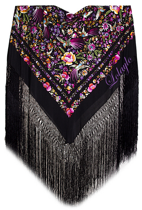 Nº 46.  MANTÓN DE MANILA EN SEDA NATURAL COLOR NEGRO  CON BORDADOS      DE FLORES Y COLIBRÍES MULTICOLOR  445€. MEDIDAS  1.30 x 1.30 cm. MAS 60cm. DE FLECADURA Y ENREJADO DE SEDA.
