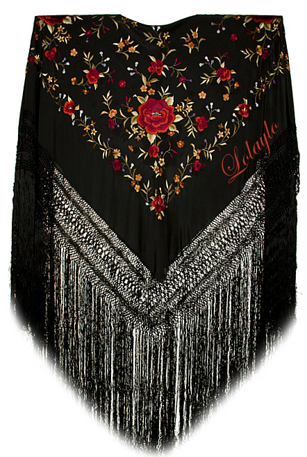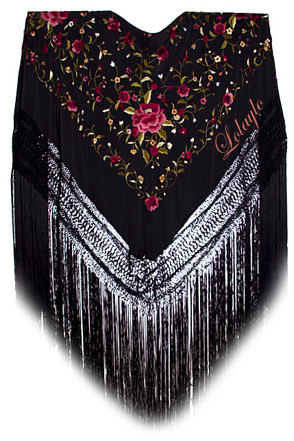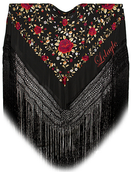 NEGRO MULTICOLOR letras rojasNº 6.1  MANTÓN DE MANILA EN SEDA NATURAL  COLOR NEGRO CON BORDADOS      DE HILO DE SEDA MULTICOLOR  Y FLECADURA DE SEDA  230€.  MEDIDAS              140x140cm.  MAS 60cm. DE FLECADURA Y ENREJADO SEDA.