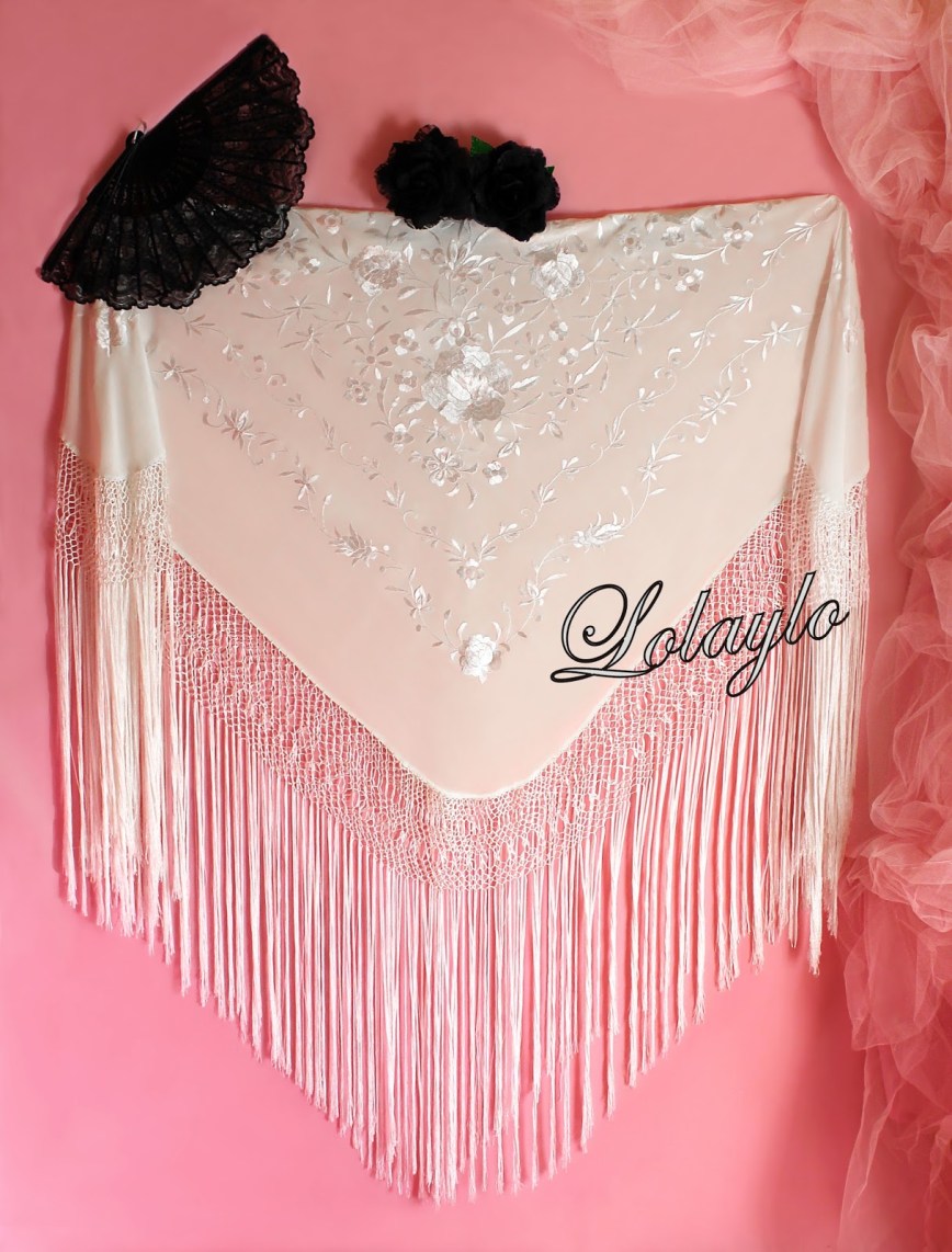 Nº 21.  MANTÓN DE MANILA EN SEDA NATURAL   COLOR MARFIL CON BORDADOS    DE  HILO DE SEDA EN EL MISMO TONO 230€.  MEDIDAS  130×130 cm.  MAS  60 cm.  DE FLECADIURA Y ENREJADO SEDA.   Disponible en diferentes colores.