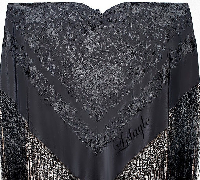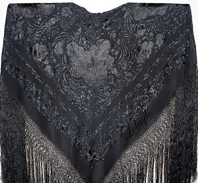MANTÓN NEGRO-PLATANº 18.1     MANTÓN ANTERIOR EN SEDA NEGRA BORDADO SEDA COLOR PLATA 230€.  TAMBIÉN DISPONIBLE CON LOS BORDADOS EN COLOR BEIGE Y COLOR MARFIL.