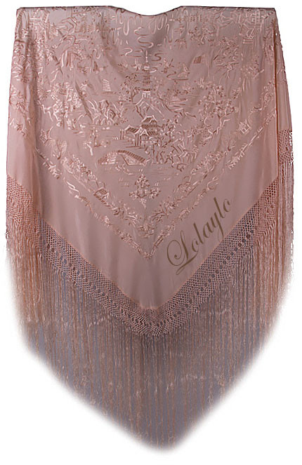 Nº 32.  MANTÓN DE MANILA EN SEDA NATURAL COLOR SALMÓN CON MOTIVOS        CHINESCOS  275€.  MEDIDAS 1.30 x 1.30 cm. MAS 60 cm. DE FLECADURA Y ENREJADO. Gran variedad de colores en todos los modelos. No dude en consultarnos si no encuentra lo que busca.