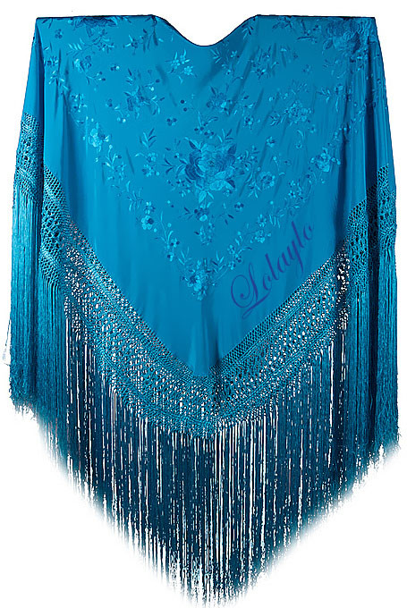 Nº  62.  MANTÓN DE MANILA EN SEDA COLOR TURQUESA Y BORDADOS EN EL          MISMO TONO  499€.  MEDIDAS  1.30×1.30 cm. MAS 60 cm. DE FLECADURA Y ENREJADO.