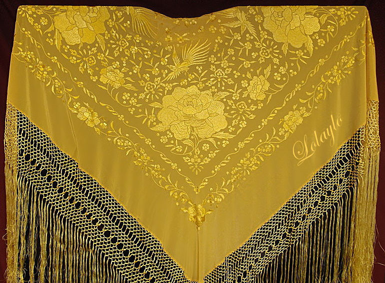 LolayNº 63. MANTÓN DE MANILA EN SEDA NATURAL COLOR MOSTAZA BORDADO CON    HILO DE SEDA NEGRA.  140×140 cm. MAS 60  cm. DE FLECADURA Y  ENREJADO.  CAREGORÍA EXTRA.  Precio 1.420€.